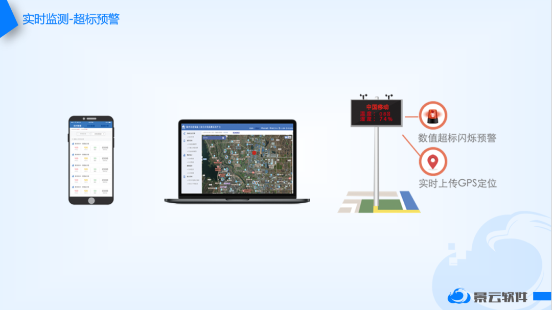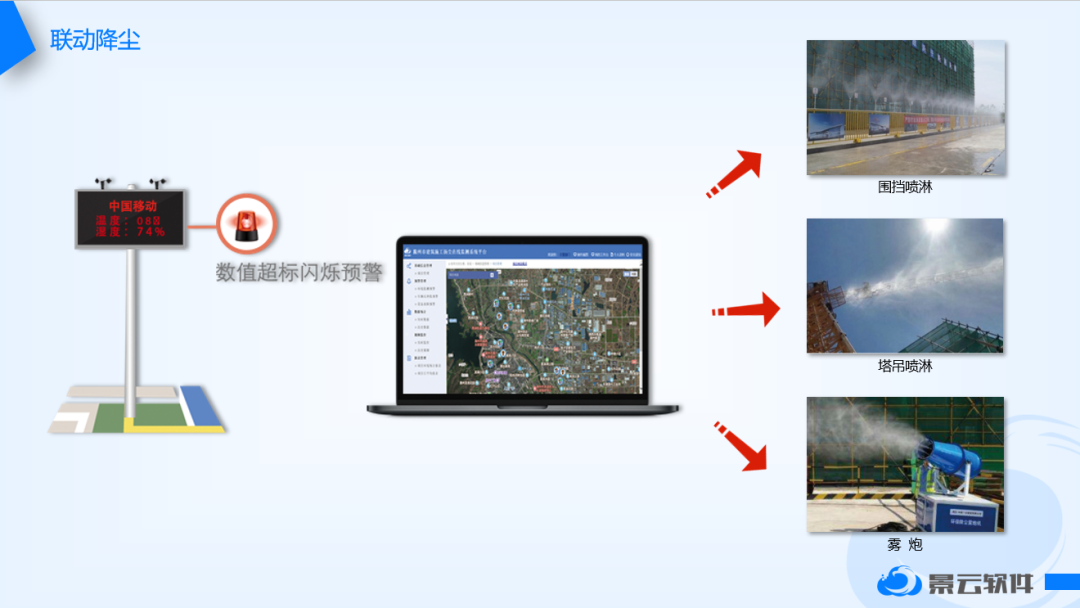 景云智慧工地-绿色施工系统:通过在施工区域布置数字化环境监控系统,对噪声、温度、湿度、风速、风向、PM2.5、PM10进行实时监控,实现对工地扬尘排放状况进行24小时跟踪监测,对超过预定排放值的建设工地进行预警,并启动联动降尘设备。