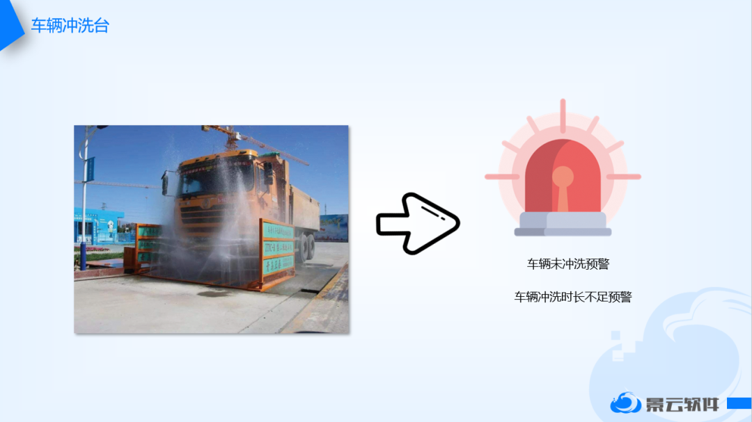 通过视频AI分析和红外对射等手段,对车辆冲洗情况进行监控,当车辆没有从冲洗台经过或冲洗时长不足,系统会推送预警信息,并抓拍照片以备回溯。