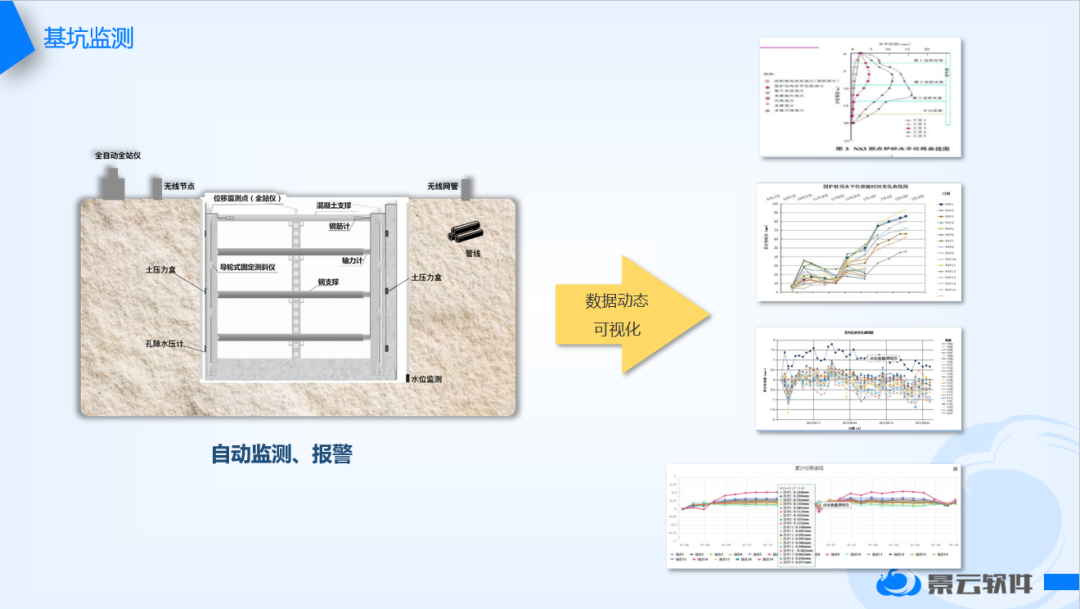 科技的加入,保障了工作人员的安全,对整个基坑施工过程实现实时采集、无线传输、数据汇总分析、超限预警报警等功能。