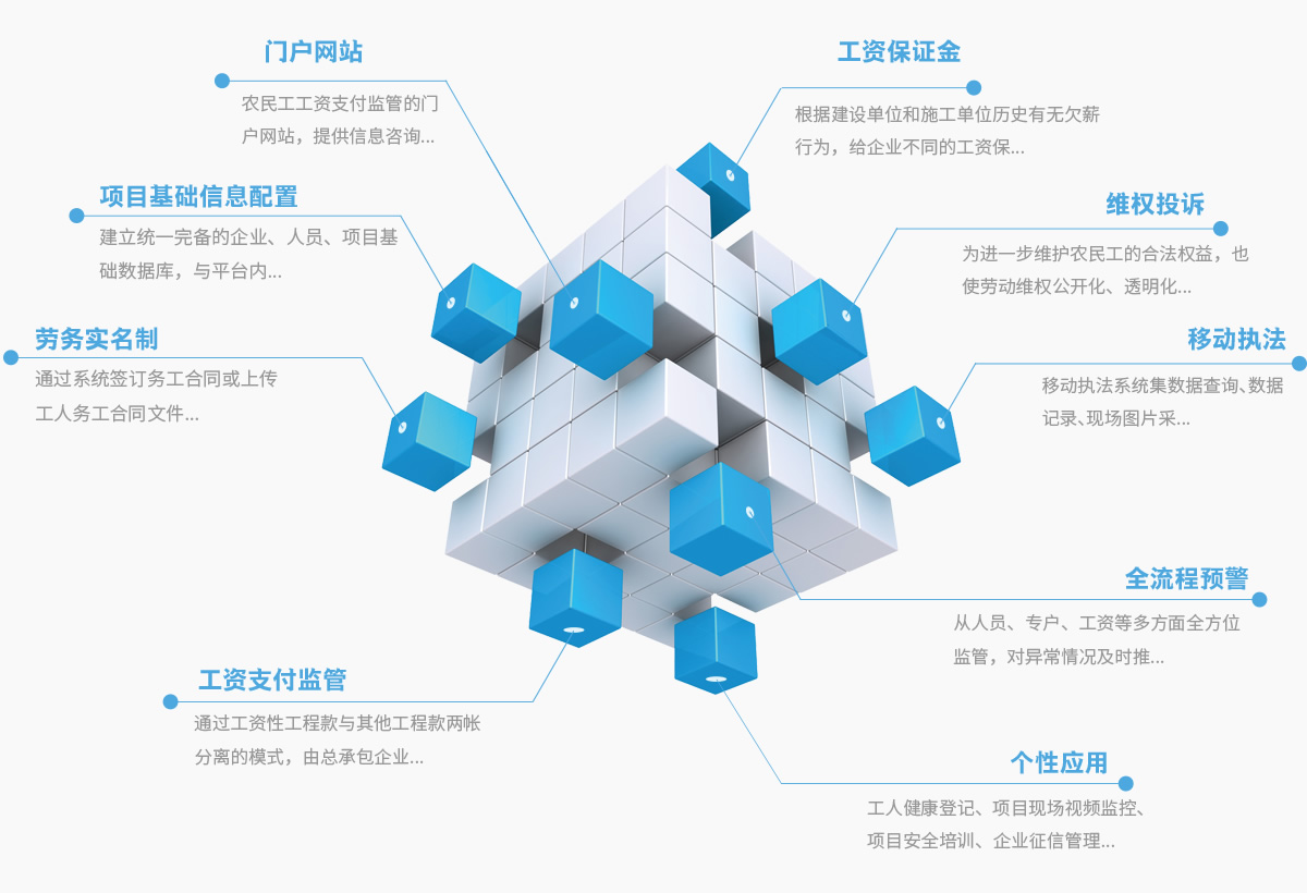 农民工工资支付监管的门户网站,提供信息咨询、流程查询、维权投诉、征信发布等功能,提供领域内有关的全部深度信息和相关服务,成功解决了消费者投诉无门、政府信息传递不畅等问题,无需登录即可查看网站内所有信息,搭建起了农民工、企业、主管部门间信息传递互通的最佳渠道。